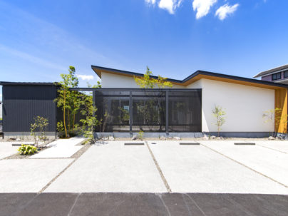 - 白壁と木目の格子を美しく組み合わせたモダンな平屋