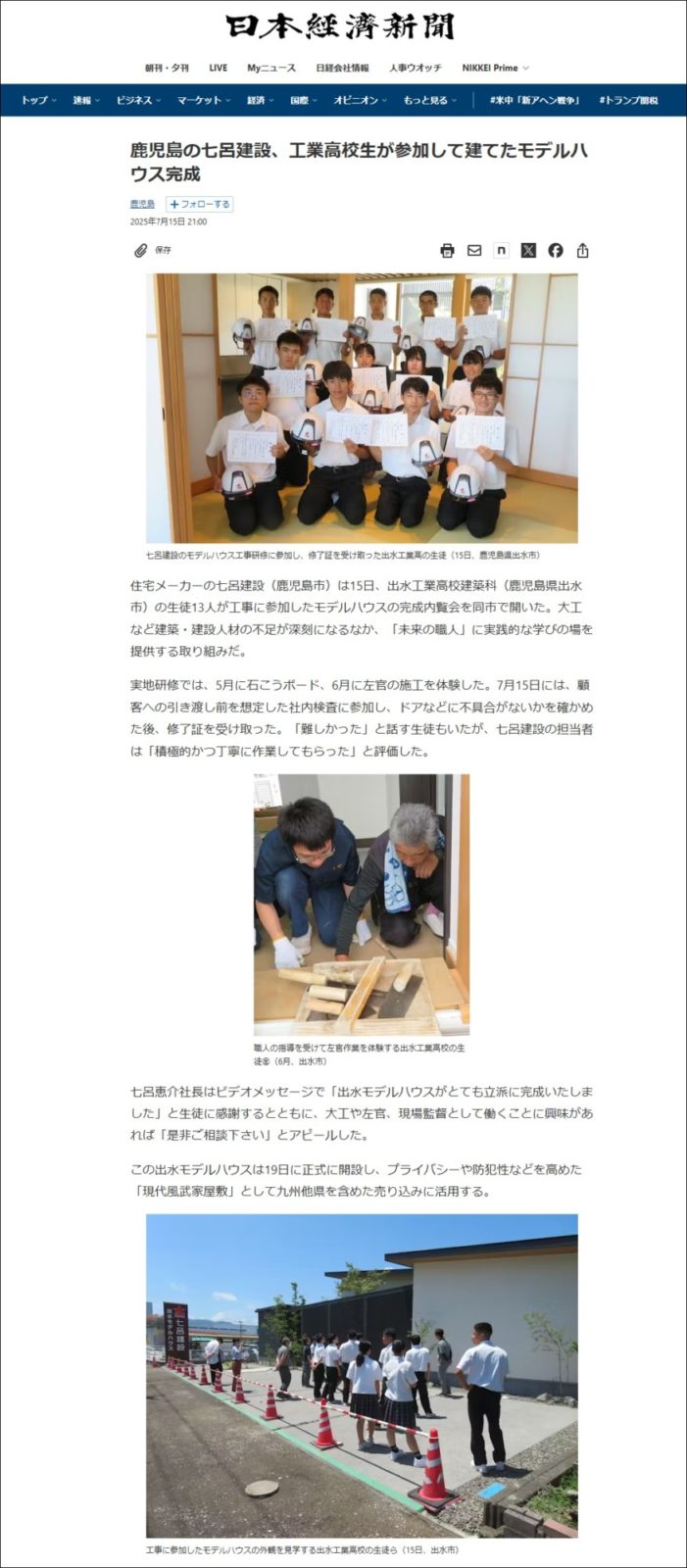 2025年7月15日(火)付の日本経済新聞(WEB)に七呂建設の建築実地研修プロジェクトについて掲載されました。