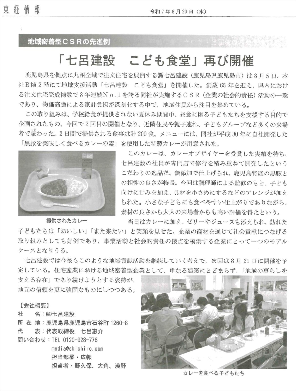 2025年8月20日(水)付の東経情報に七呂建設のこども食堂について掲載されました。