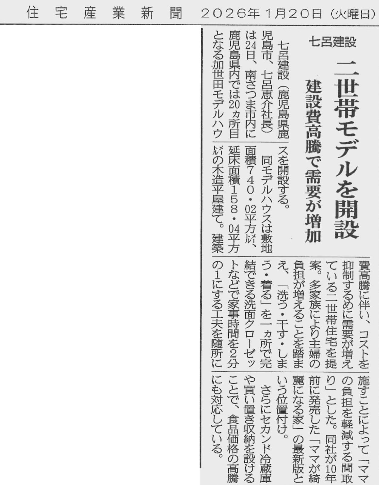 2026年1月20日(火)付の住宅産業新聞に、七呂建設の加世田モデルハウスについて掲載されました。