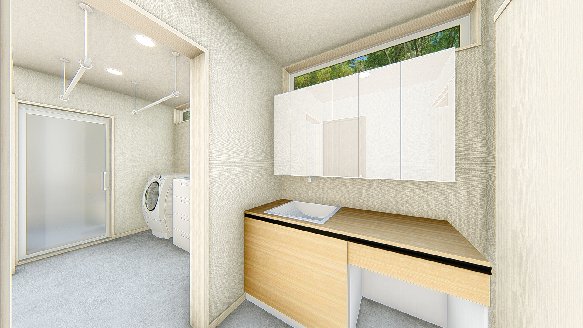 お出かけ前の身支度も帰宅後の手洗いもスムーズになる玄関ホール直通の洗面室。浴室まで一直線につながっているから、外遊びで汚れてもすぐに入浴できます。
