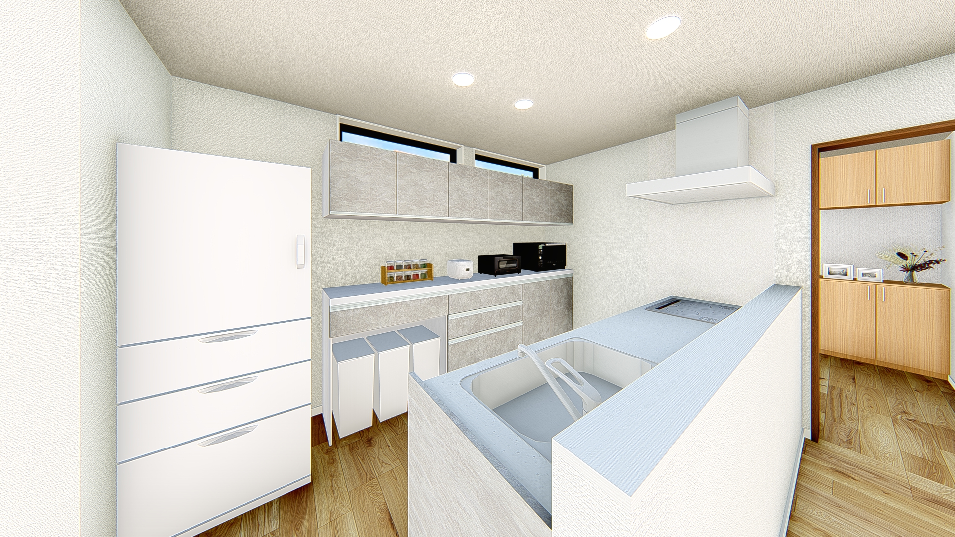 買い物帰りの荷物も収納しやすい、玄関に近い配置の対面キッチン。帰宅した人が必ず前を通るから、「ただいま」「おかえり」の声かけもしやすくなります。