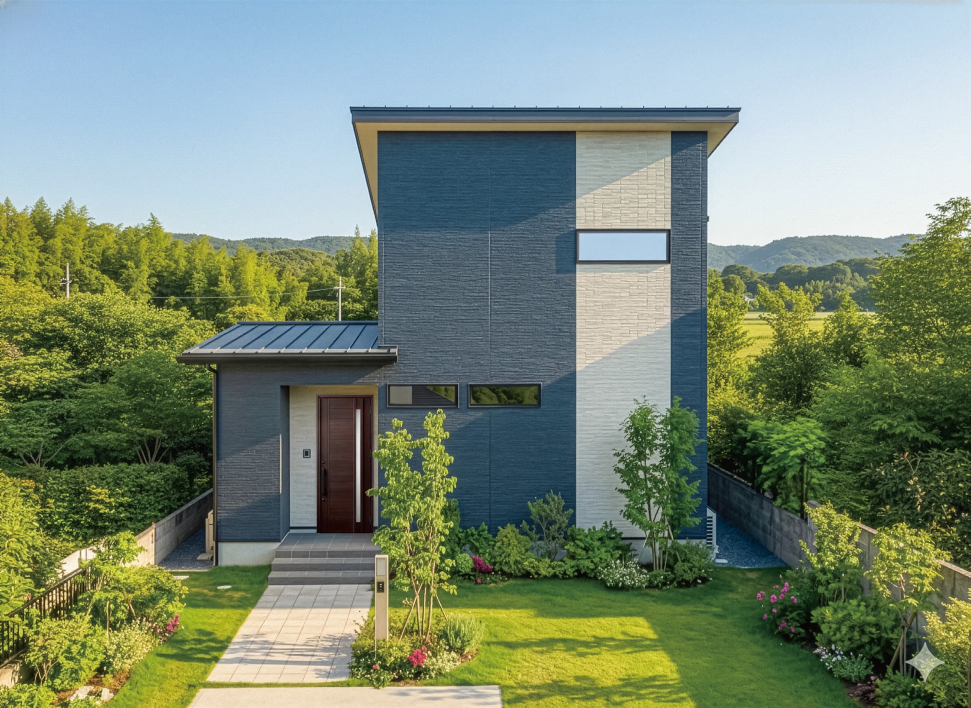 柔らかなグレーの外観にホワイトの縦ラインを入れて、高さを強調したスタイリッシュな2階建て。5.76kWの太陽光パネルを搭載したGX志向型住宅で、環境負荷の軽減と快適な暮らしを両立します。