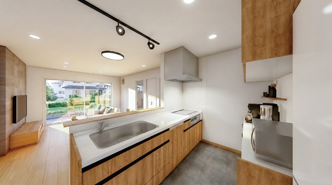 素材感が引き立つコンカーボの床材を採用したキッチン。スパイスニッチや対面カウンターを付けて機能性を高めながら、モダンな配色バランスにもこだわりました。