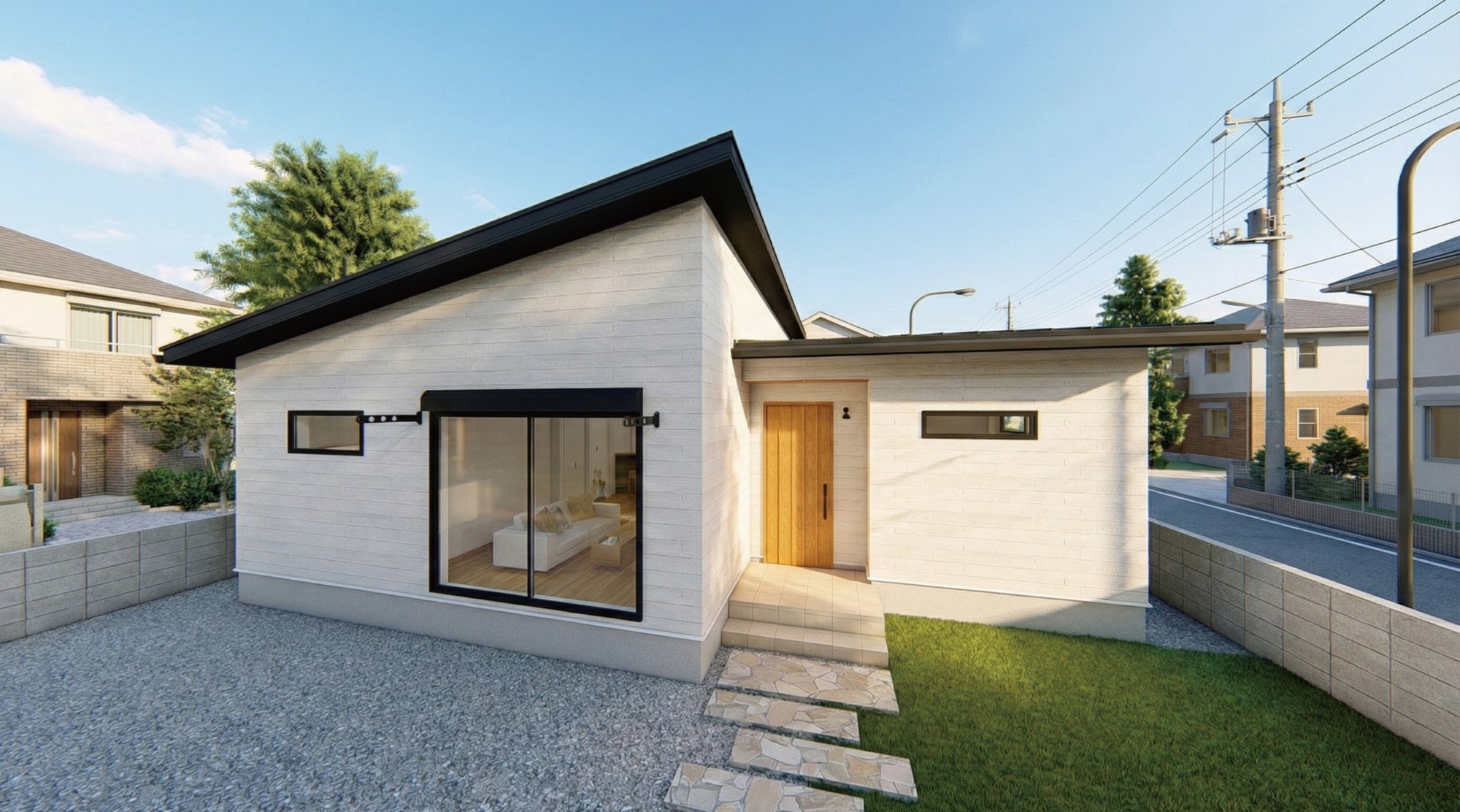 スタイリッシュなグレーの外装に温かみのある木目調のドアをバランスよく組み合わせて、洗練された印象に仕上げた外観。無駄なく心地よく暮らせるコンパクトな27坪の平屋に、3台分の駐車スペースも確保しました。