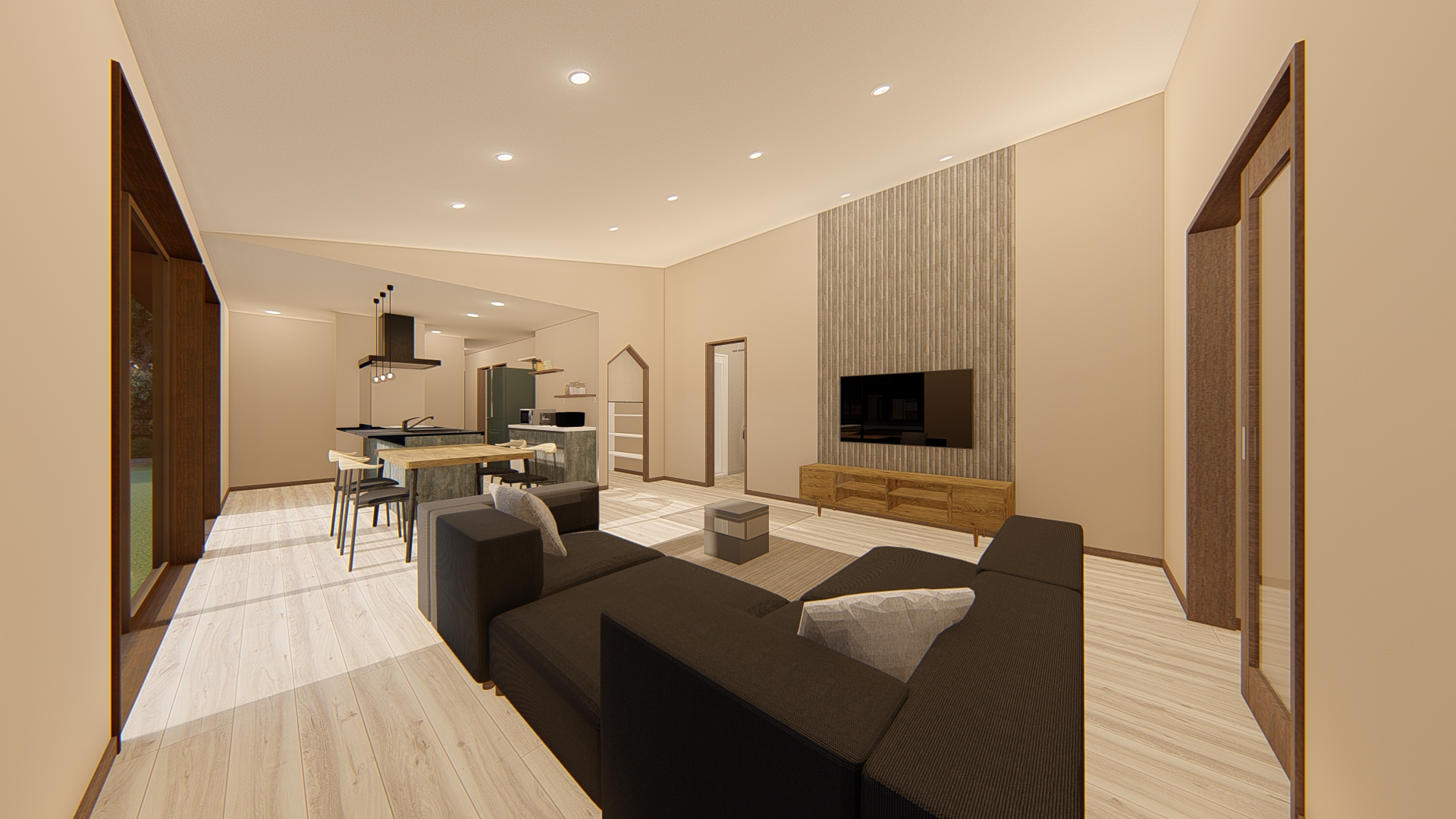 22.7帖のゆったりとしたLDKは、ダイニングとリビングの上部15帖にわたる勾配天井で、開放感バツグン👍明るく広いリビングで家族時間が増える設計です。