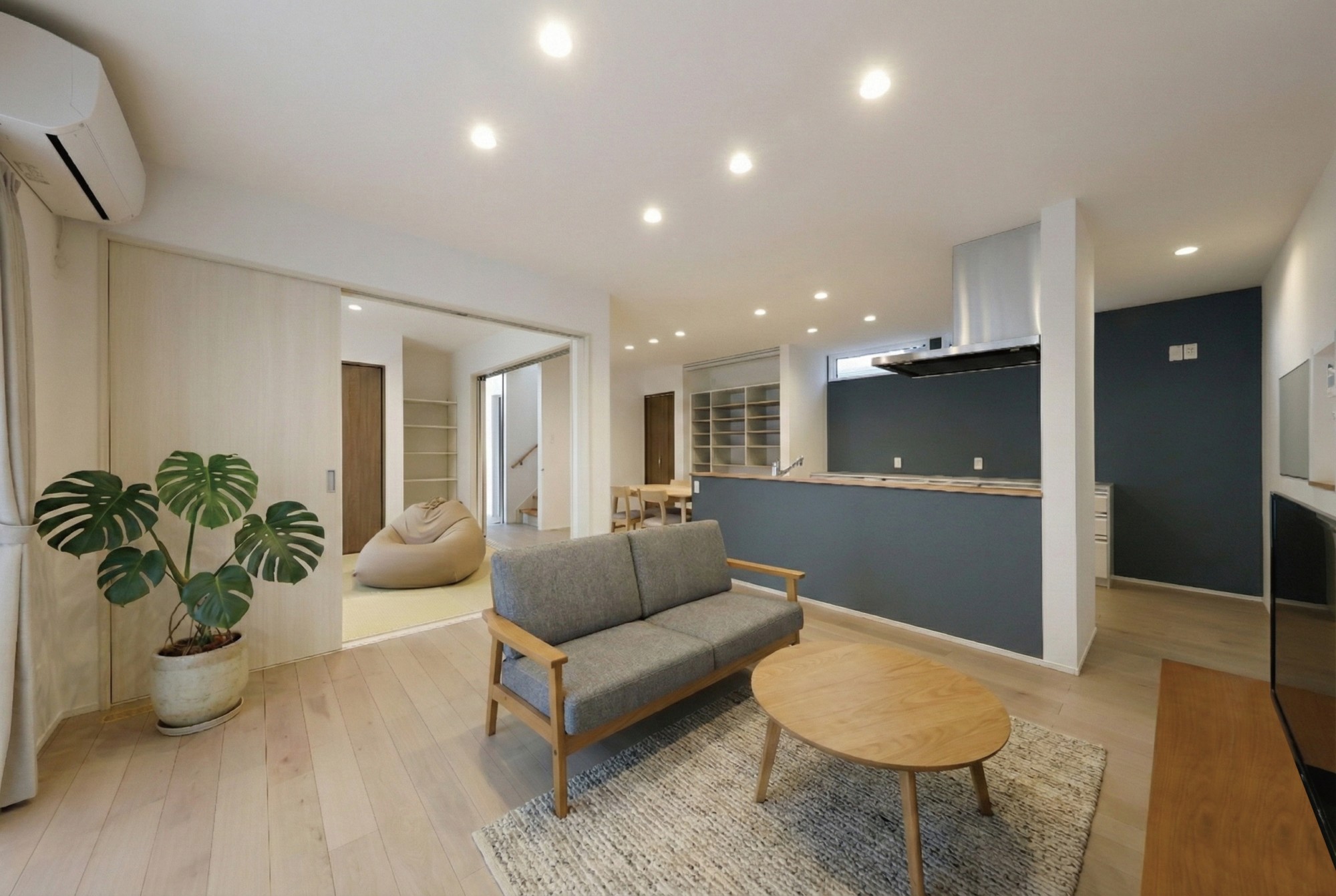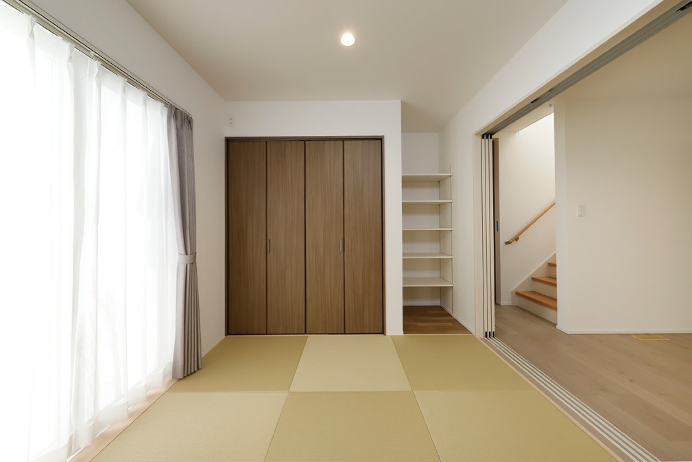 リビングとダイニングの両側からアクセスできる和室は、ゴロゴロお昼寝を楽しめるスペース。収納と押入れ付きで、扉で仕切れば独立した客間にもなります。
