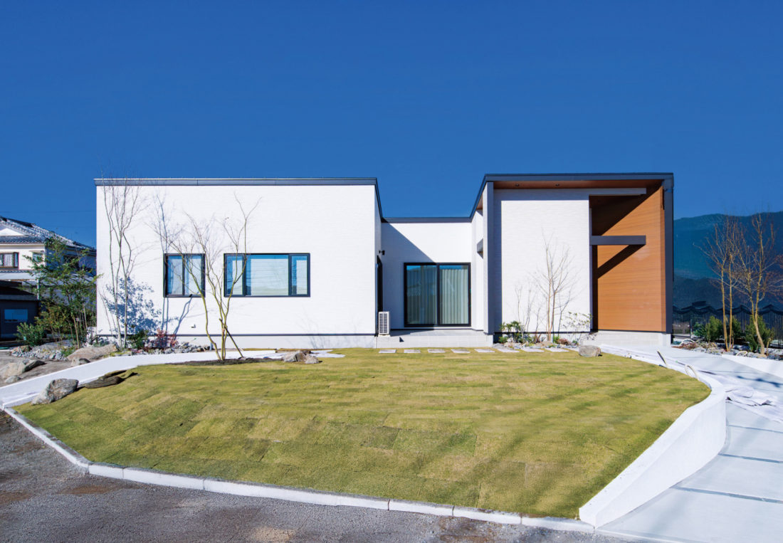 LDKとサニタリーをつなぐヌックは、家事の合間に一息つけるスペース。前後に庭をのぞむ癒しの景色とスプーンカットの床の足触りに腰かけるたび癒されます。