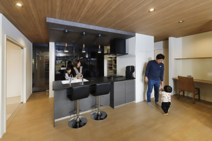 背面収納を含め、ダーク系の配色でまとめたキッチン。バーカウンターの雰囲気を活かし、非日常を楽しむ場所にもなっている。
