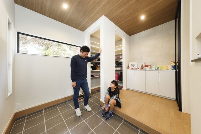 玄関は、L字形の土間にシューズクロークを配置してスッキリと。悪天候時には自転車をしまえるよう、土間スペースにゆとりを持たせた。