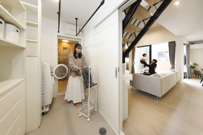 浴室とランドリールーム、ファミリークローゼットを一直線に並べて「洗う・干す・しまう・着る」を効率化。収納もたっぷり。