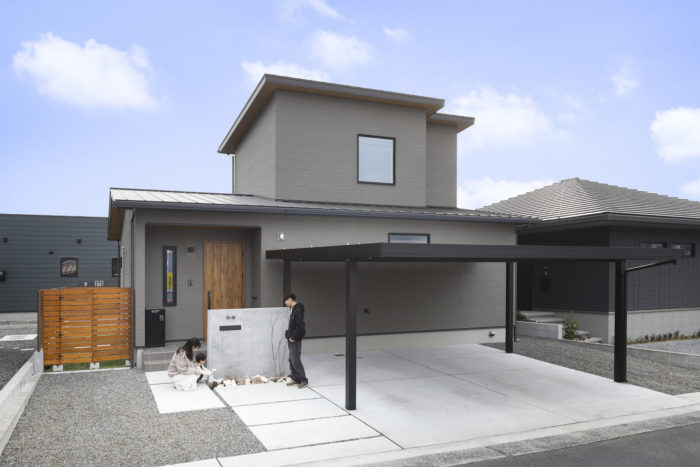 グレーのすっきりした印象の外壁に、木目調の玄関が柔らかなアクセントを添えています。カーポートがあるので雨の日も便利です。