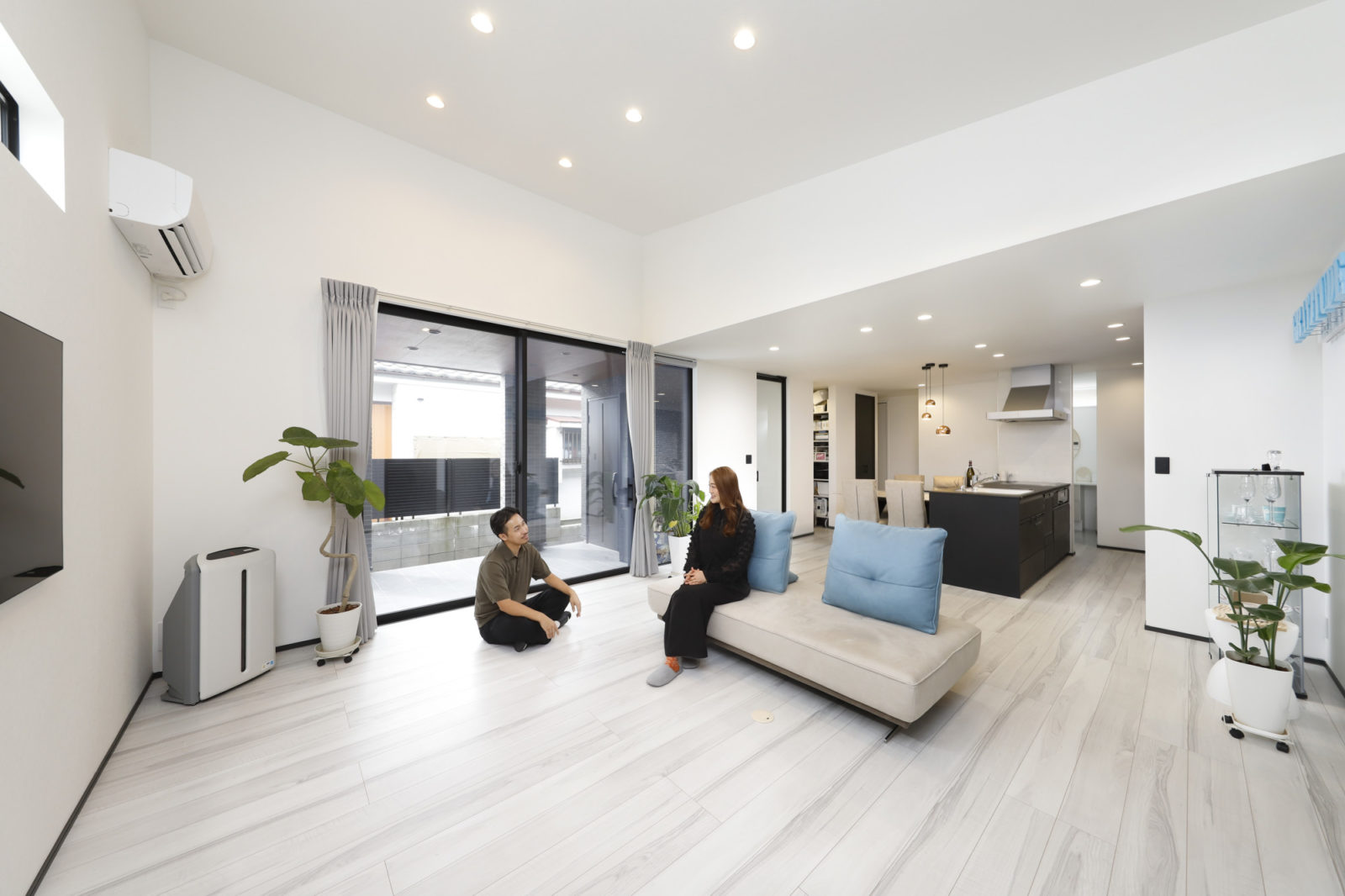 大開口と勾配天井が広がりを演出するLDKは、ホームパーティーにも最適な上質なくつろぎの空間。玄関直通のファミリークローゼットやキッチン横の水回りなど、家事がスムーズに進む動線を確保しつつ、来客動線と分離することで、ストレスフリーな生活をかなえます。暮らしやすさとおもてなしの心を調和させた、洗練された住まいを実現しました。