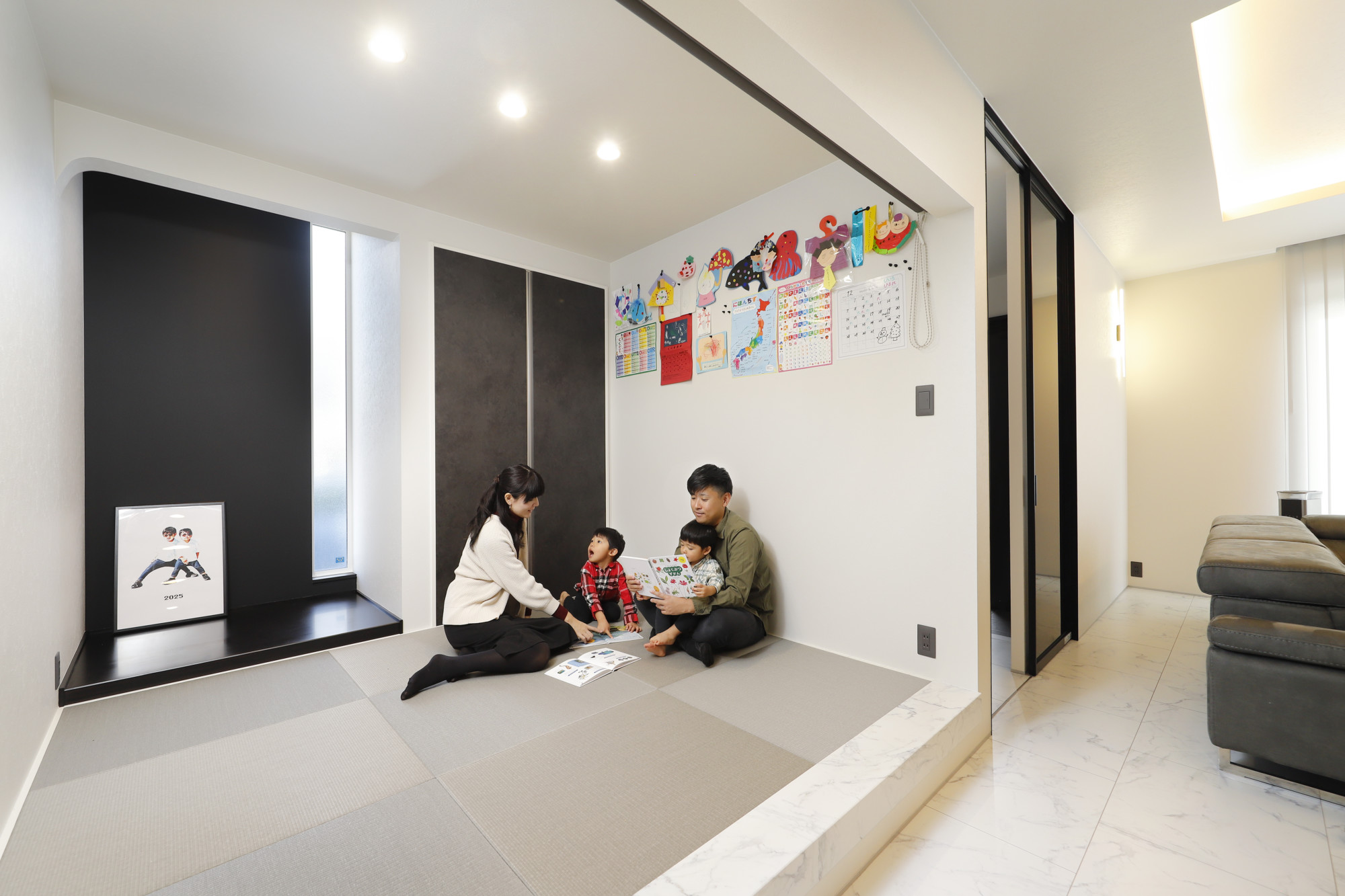 ロールスクリーンで仕切れる小上がり和室は、客間としてや子供の遊び場など一室何役もこなせます。框部分をフローリングとそろえ、違和感なくなじむ設えが魅力。